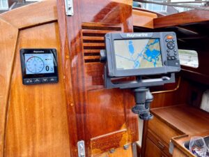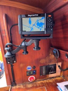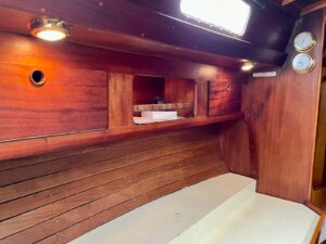Binnenin de boot zijn er mooi klassieke messing plafonnieres gemonteerd, maar natuurlijk wel met LED techniek. Ook kwam er een nieuwe schakelpaneel met automatische zekeringen (erg handig), een dual circuit hoofdschakelaar met noodstand (aanrader!), diverse 12v stopcontacten, een compleetRaymarine navigatiepakket met NMEA2000/Seatalk NG netwerk en uiteraard een